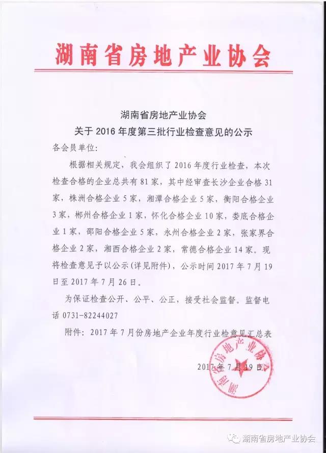 湖南省房地產業協會關于2016年度第三批行業檢查意見的公示