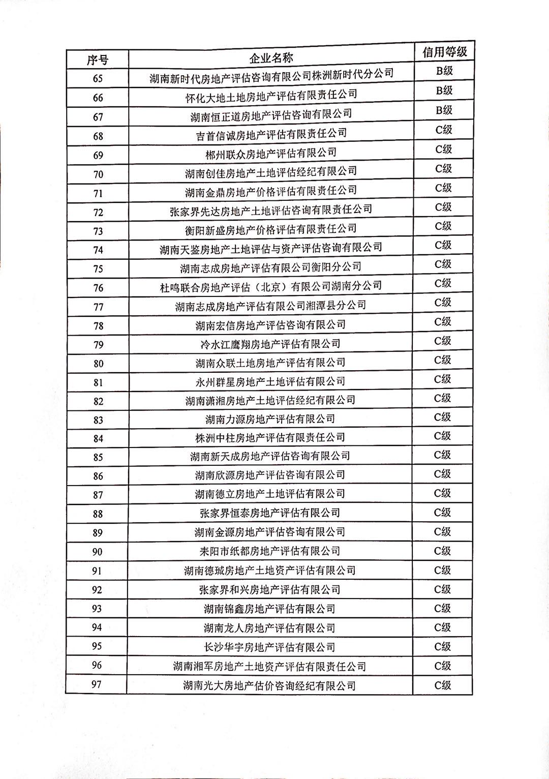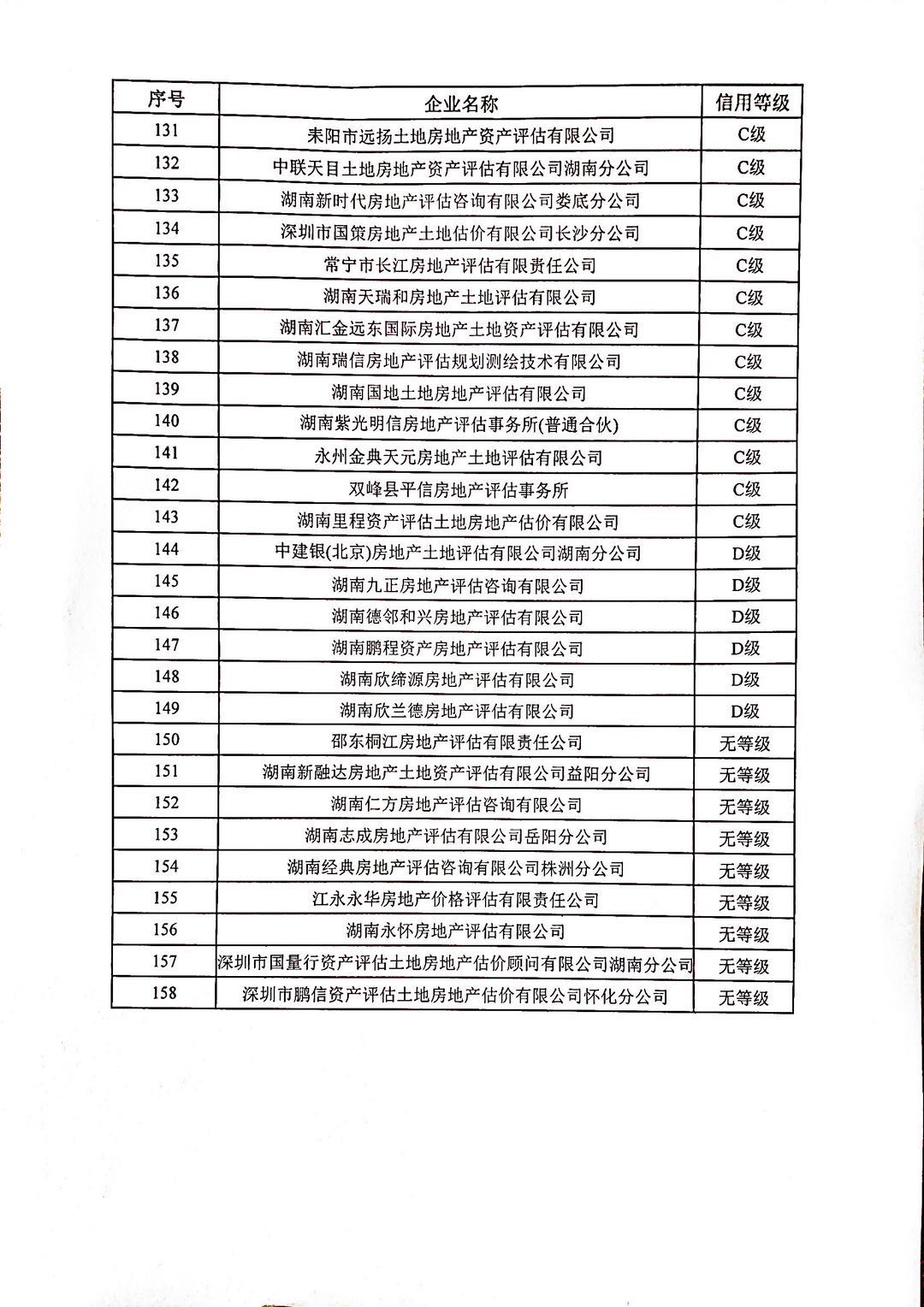根據《湖南省房地產業協會房地產行業信用評價管理辦法(試行)》(湘房協〔2018〕15號)相關規定,我會按程序對全省158家評估機構進行信用評價,其中信用等級為A級的企業14家,信用等級為B級的企業53家,信用等級為C級的企業76家,信用等級為D級的企業6家,無等級9家,現予公布。