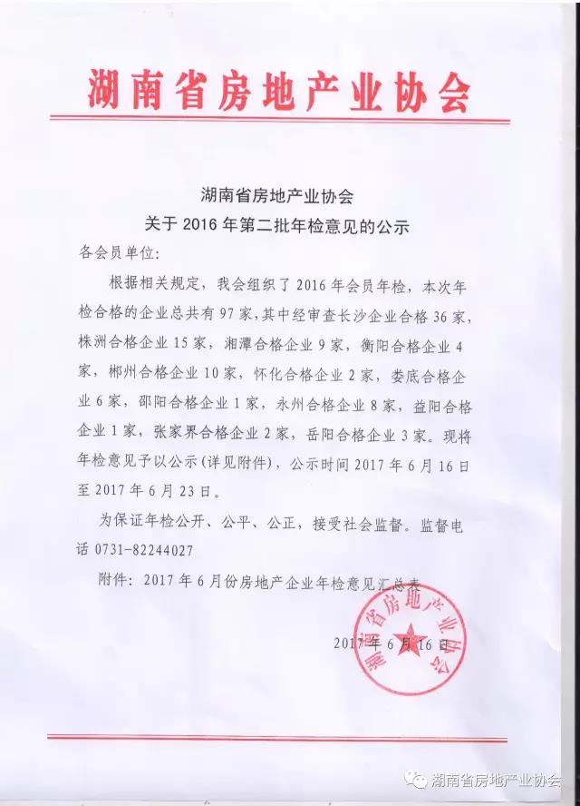 湖南省房地產業協會關于2016年第二批年檢意見的公示