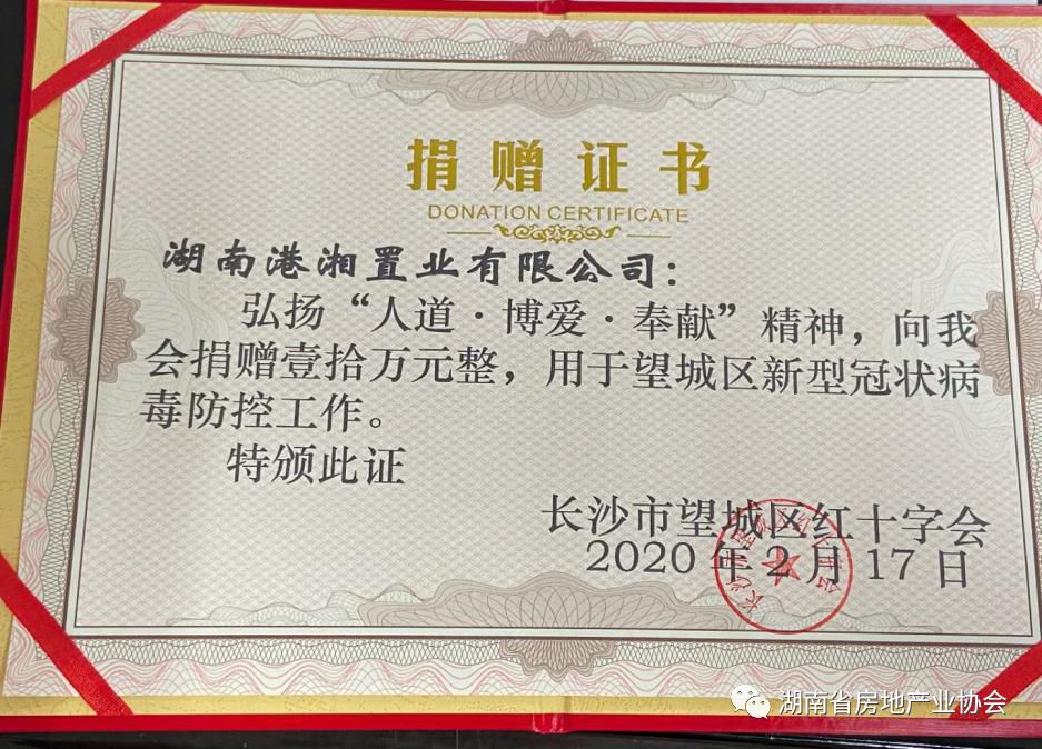 自新型冠狀病毒肺炎1月份爆發(fā)以來,疫情發(fā)展牽動著全國人民的心。湖南長沙因地緣因素,成為了受疫情影響較為嚴重的區(qū)域之一,在抗疫物資和人員方面出現(xiàn)短缺。為支援一線抗疫工作者,湖南港湘置業(yè)有限公司響應政府號召,積極承擔社會責任,先后向長沙市望城區(qū)紅十字會捐贈10萬元、湖南省房地產(chǎn)協(xié)會捐贈價值1萬元新型冠狀病毒防控物資。