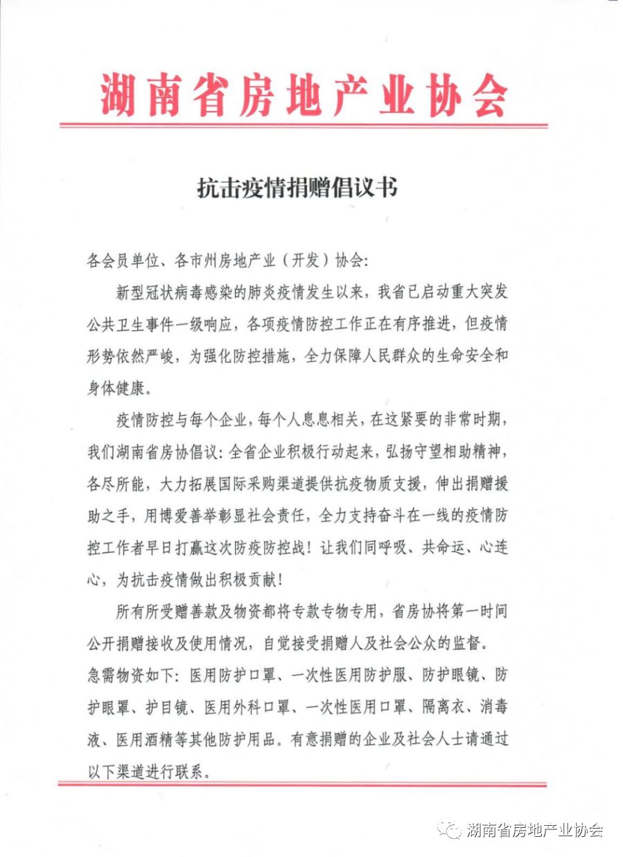 一方有難,八方支援,抗擊疫情,共克時(shí)艱!倡議發(fā)出后,各開(kāi)發(fā)會(huì)員單位積極響應(yīng),奉獻(xiàn)愛(ài)心!截止至2月21日,全省共17家省房協(xié)開(kāi)發(fā)會(huì)員單位加入愛(ài)心捐贈(zèng)隊(duì)伍,其中大漢城鎮(zhèn)建設(shè)有限公司捐贈(zèng)口罩20000個(gè);湖南保利房地產(chǎn)開(kāi)發(fā)有限公司捐贈(zèng)2500ml的酒精100瓶、20KG消毒液的80桶;湖南省中欣房地產(chǎn)開(kāi)發(fā)集團(tuán)有限公司捐贈(zèng)護(hù)目鏡200副、酒精50桶、方便面20箱、口罩1000個(gè);長(zhǎng)沙雙瑞房地產(chǎn)開(kāi)發(fā)有限公司捐贈(zèng)價(jià)值20000元口罩;長(zhǎng)沙方略投資發(fā)展有限公司捐贈(zèng)價(jià)值10000元口罩等等(詳見(jiàn)附件)……