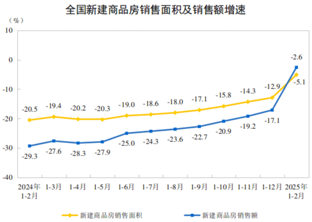 根據國家統計局數據,1-2月份,新建商品房銷售面積10746萬平方米,同比下降5.1%,降幅比上年全年收窄7.8個百分點;其中住宅銷售面積下降3.4%,降幅收窄10.7個百分點。新建商品房銷售額10259億元,下降2.6%,降幅收窄14.5個百分點;其中住宅銷售額下降0.4%,降幅收窄17.2個百分點。