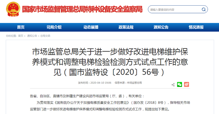 市場監管總局關于進一步做好改進電梯維護保養模式和調整電梯檢驗檢測方式試點工作的意見(國市監特設〔2020〕56號)