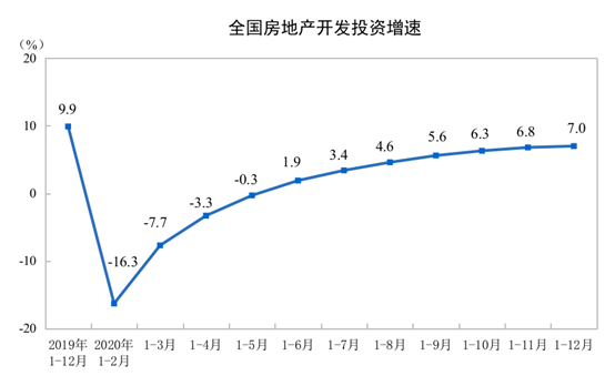 2020年1—12月份,全國房地產開發投資141443億元,比上年增長7.0%,增速比1—11月份提高0.2個百分點,比上年回落2.9個百分點。其中,住宅投資104446億元,增長7.6%,增速比1—11月份提高0.2個百分點,比上年回落6.3個百分點。