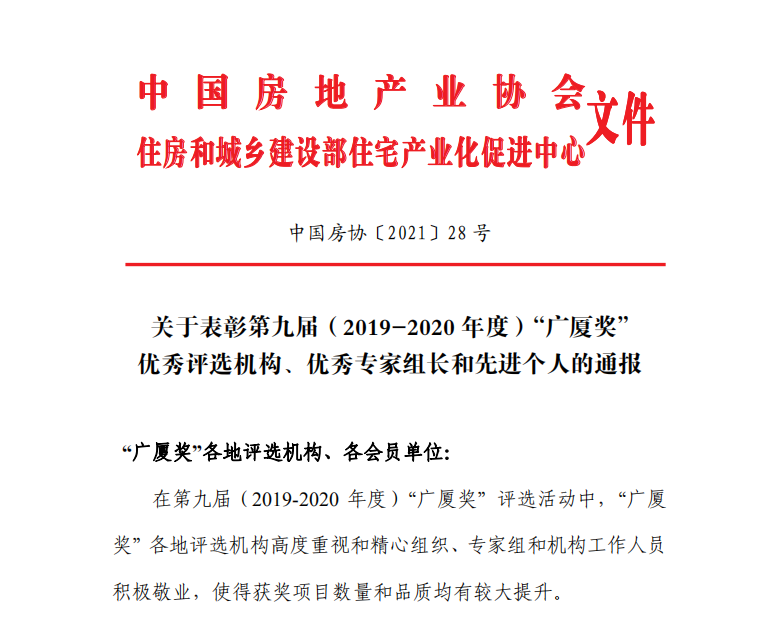 2021年3月16日,中國房地產業協會、住房和城鄉建設部住宅產業化促進中心發布了《關于表彰第九屆(2019-2020年度)“廣廈獎”優秀評選機構、優秀專家組長和先進個人的通報》。