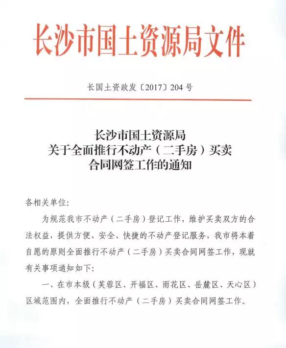 長沙市國土資源局關于全面推行不動產(二手房)買賣合同網簽工作的通知
