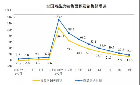 1—9月份,商品房銷售面積130332萬平方米,同比增長(zhǎng)11.3%;比2019年1—9月份增長(zhǎng)9.4%,兩年平均增長(zhǎng)4.6%。其中,住宅銷售面積增長(zhǎng)11.4%,辦公樓銷售面積增長(zhǎng)3.1%,商業(yè)營(yíng)業(yè)用房銷售面積增長(zhǎng)0.7%。商品房銷售額134795億元,增長(zhǎng)16.6%;比2019年1—9月份增長(zhǎng)20.9%,兩年平均增長(zhǎng)10.0%。其中,住宅銷售額增長(zhǎng)17.8%,辦公樓銷售額增長(zhǎng)0.5%,商業(yè)營(yíng)業(yè)用房銷售額增長(zhǎng)0.5%。