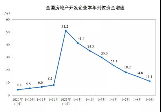 1—9月份,房地產(chǎn)開發(fā)企業(yè)到位資金151486億元,同比增長(zhǎng)11.1%;比2019年1—9月份增長(zhǎng)16.0%,兩年平均增長(zhǎng)7.7%。其中,國(guó)內(nèi)貸款18770億元,下降8.4%;利用外資59億元,下降36.9%;自籌資金47212億元,增長(zhǎng)6.1%;定金及預(yù)收款56689億元,增長(zhǎng)25.6%;個(gè)人按揭貸款24124億元,增長(zhǎng)10.7%。