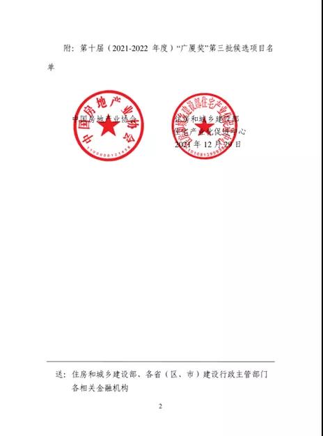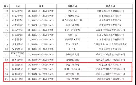 12月29日,由中國房地產(chǎn)業(yè)協(xié)會、住房和城鄉(xiāng)建設部住宅產(chǎn)業(yè)化促進中心共同組織的第十屆(2021-2022年度)“廣廈獎”第三批候選項目名單重磅出爐!經(jīng)湖南省房地產(chǎn)業(yè)協(xié)會推薦的長沙市“中建?鈺和城”、懷化市“凱邦?云谷天境”“濱江美墅一期”“佳惠?懷熙府”四個項目榮獲殊榮!