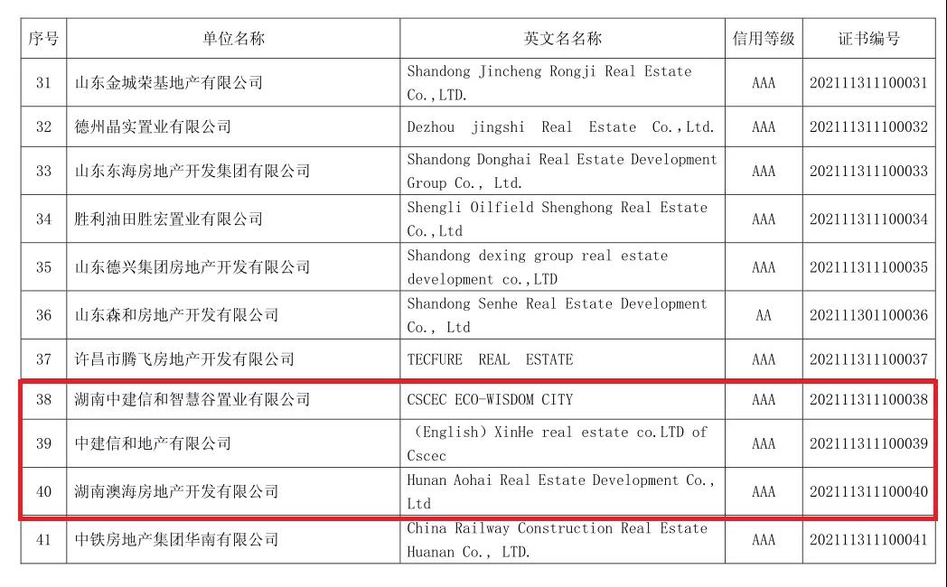 12月29日,中國房地產(chǎn)業(yè)協(xié)會(huì)公布2021年信用等級(jí)AAA房地產(chǎn)開發(fā)企業(yè)名單,我會(huì)會(huì)員單位中建信和地產(chǎn)有限公司、湖南澳海房地產(chǎn)開發(fā)有限公司、湖南中建信和智慧谷置業(yè)有限公司獲得“2021年信用等級(jí)AAA級(jí)房地產(chǎn)開發(fā)企業(yè)”評(píng)價(jià)。
