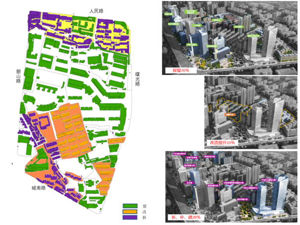 保留區域擬實施微改造,主要包括雨污管網改造、道路提質、建筑外立面改造、景觀綠化提質、新增配套服務設施等。