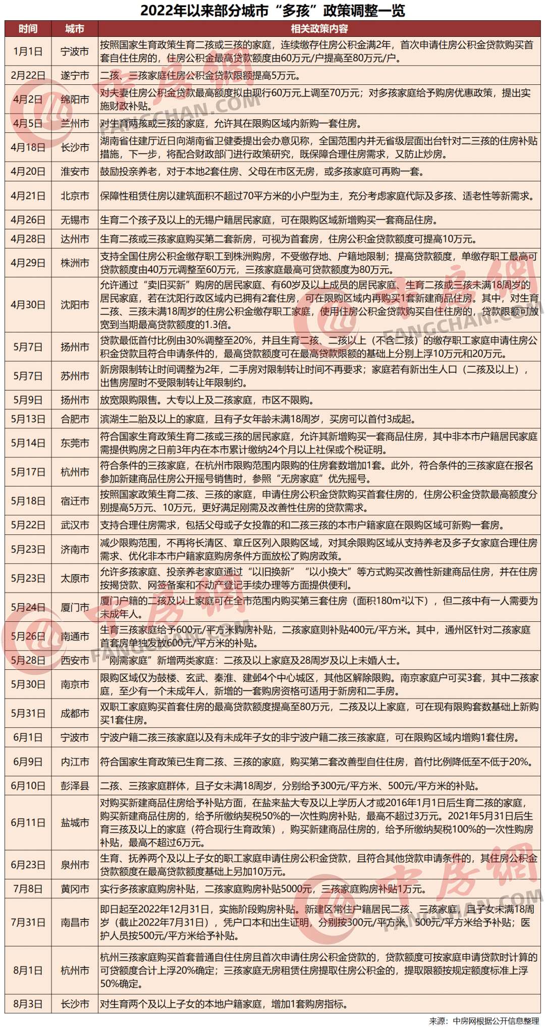 此后,全國多地陸續對多孩政策進行了調整。據中房網不完全統計,自年初以來全國約有超過30個城市,出臺相關政策35余次。內容涉及提高公積金貸款額度、實施優惠利率、出臺購房補貼,以及“松綁”限購和限售等方式,給予多孩家庭更多的購房支持。
