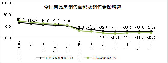 1—8月,全國商品房銷售面積87890萬平方米,同比下降23.0%,其中住宅銷售面積下降26.8%。商品房銷售額85870億元,下降27.9%,其中住宅銷售額下降30.3%。