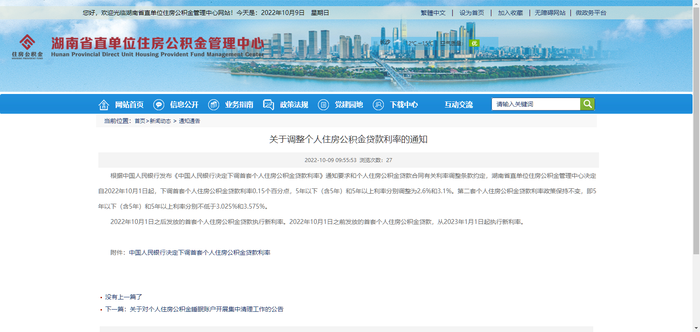 10月9日,湖南省直公積金管理中心發布了《關于調整個人住房公積金貸款利率的通知》,宣布: