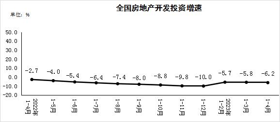 1—4月,全國房地產開發投資35514億元,同比下降6.2%;其中,住宅投資27072億元,下降4.9%。