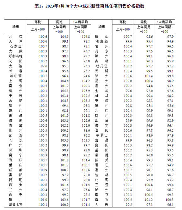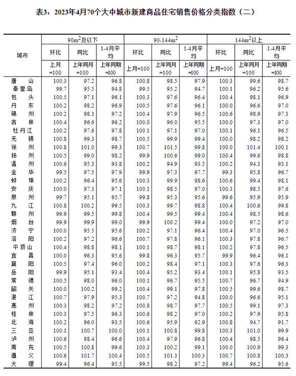 國家統計局城市司首席統計師繩國慶解讀稱,2023年4月份,70個大中城市中商品住宅銷售價格環比上漲城市個數減少,同比上漲城市個數增加。70個大中城市商品住宅銷售價格環比整體漲幅回落、二手住宅環比漲幅回落更為明顯,各線城市商品住宅銷售價格同比上漲或降勢趨緩。