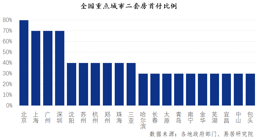 具體來(lái)看,北京二套房的首付比例最高,最多可達(dá)80%;上海、廣州和深圳也高達(dá)70%。此外,包括哈爾濱、長(zhǎng)春和太原等二線城市,其二套房的首付比例僅為30%的水平。