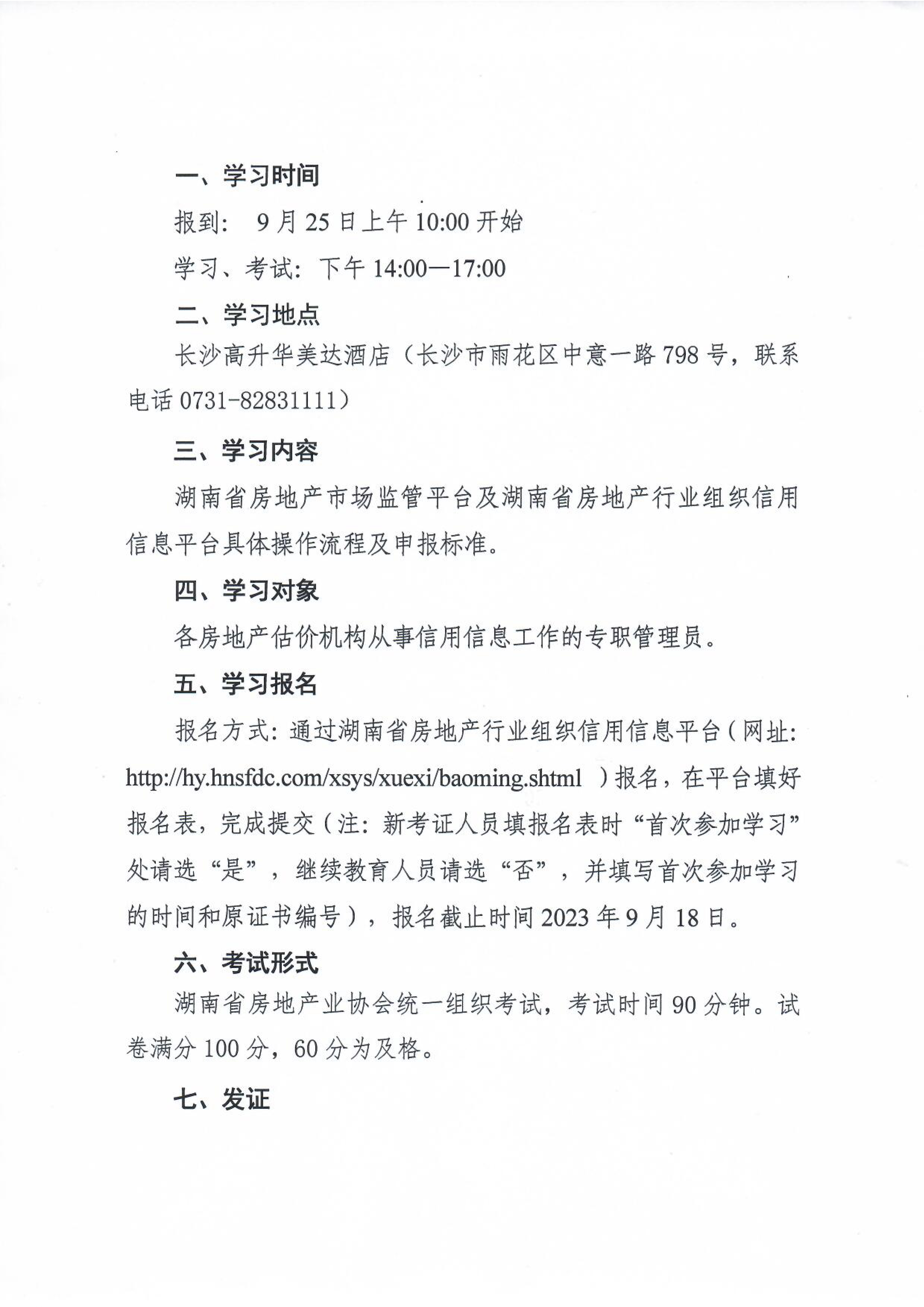 報名方式:通過湖南省房地產(chǎn)行業(yè)組織信用信息平臺(網(wǎng)址:http://hy.hnsfdc.com/xsys/xuexi/baoming.shtml )報名,在平臺填好報名表,完成提交(注:新考證人員填報名表時“首次參加學習”處請選“是”,繼續(xù)教育人員請選“否”,并填寫首次參加學習的時間和原證書編號),報名截止時間2023年9月18日。