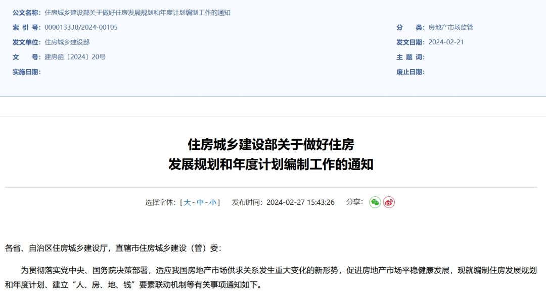 住建部表示,住房發展規劃和年度計劃是建立“人、房、地、錢”要素聯動機制的重要抓手。各地要充分認識做好住房發展規劃和年度計劃的編制實施工作的重要性,科學編制規劃,認真組織實施,根據人口變化確定住房需求,根據住房需求科學安排土地供應、引導配置金融資源,實現以人定房,以房定地、以房定錢,促進房地產市場供需平衡、結構合理,防止市場大起大落。點擊上方公眾號,閱讀更多內容……
