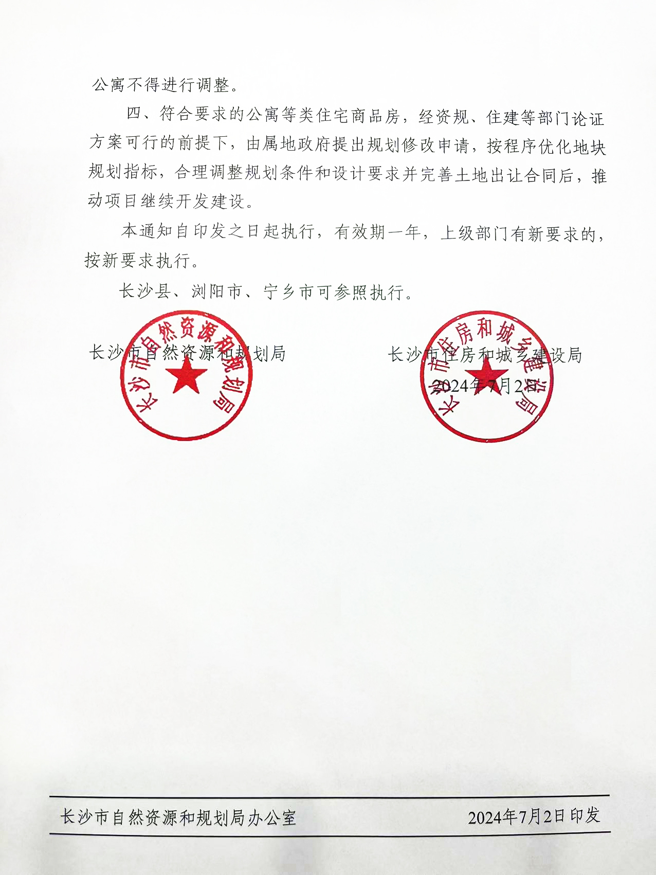7月2日,長沙市自然資源和規(guī)劃局、長沙市住房和城鄉(xiāng)建設(shè)局聯(lián)合下發(fā)《關(guān)于支持公寓等類住宅商品房調(diào)整為住宅有關(guān)事項的通知》(以下簡稱“通知”),明確在長沙市轄區(qū)范圍內(nèi)停止新的公寓等類住宅項目規(guī)劃審批,并明確多項措施支持公寓等類住宅商品房調(diào)整為住宅。