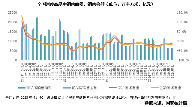 從全國維度來看,2024年三季度,整體市場延續筑底態勢,銷售面積、金額絕對量回歸年內低位,同比降幅持續收窄。