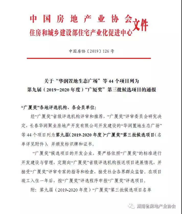 依據“廣廈獎”管理辦法和評價標準,經企業申報,“廣廈獎”省級評選機構初審及推薦,“廣廈獎”評審專家組終審,“廣廈獎”評審委員會審定,并經公示等程序,湖南省有九個項目,列入第九屆“廣廈獎”第三批候選項目名單,獲得候選項目名單有長沙市萬科四季花城(一期)、金色夢想、株洲綠地城際空間站、萬豐上院·湖韻、紫東府、宏宇新城·凱瑞名門、益陽榮盛華府、湘江壹號、宏潤華府九個項目,希望湖南有更多的優秀項目參與廣廈獎申報,提升住房品質。