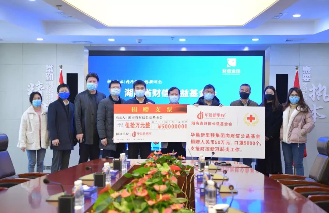 2月17日上午,湖南資產管理重要合作伙伴株洲華晨房地產開發有限責任公司(簡稱“株洲華晨地產”)向湖南財信金控集團旗下湖南省財信公益基金會(簡稱“財信公益基金”)捐贈50萬元及5000個醫用口罩,助力抗擊新冠肺炎疫情。