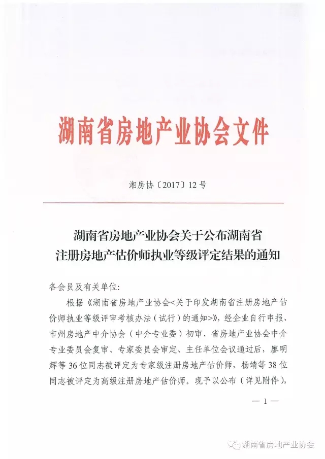 湖南省房地產(chǎn)業(yè)協(xié)會關(guān)于公布湖南省注冊房地產(chǎn)估價師執(zhí)業(yè)等級評定結(jié)果的通知