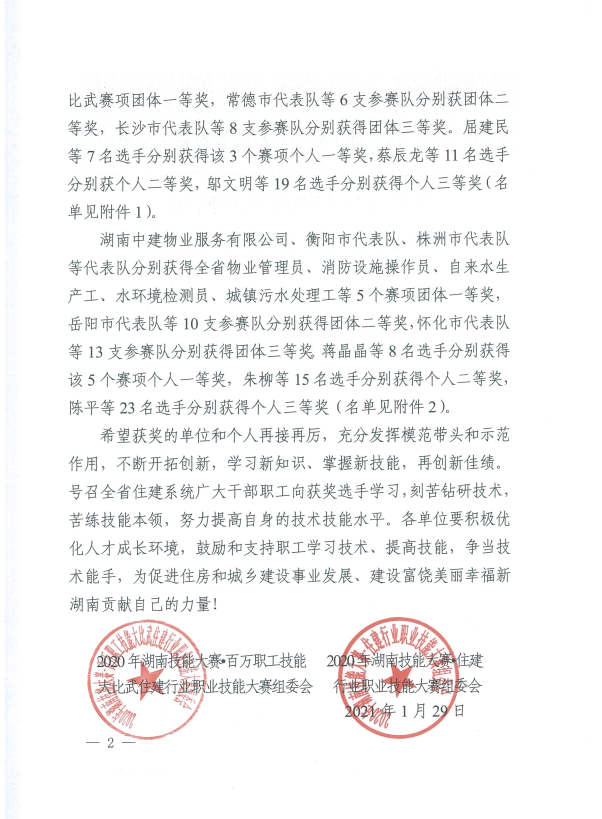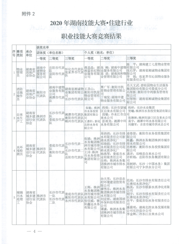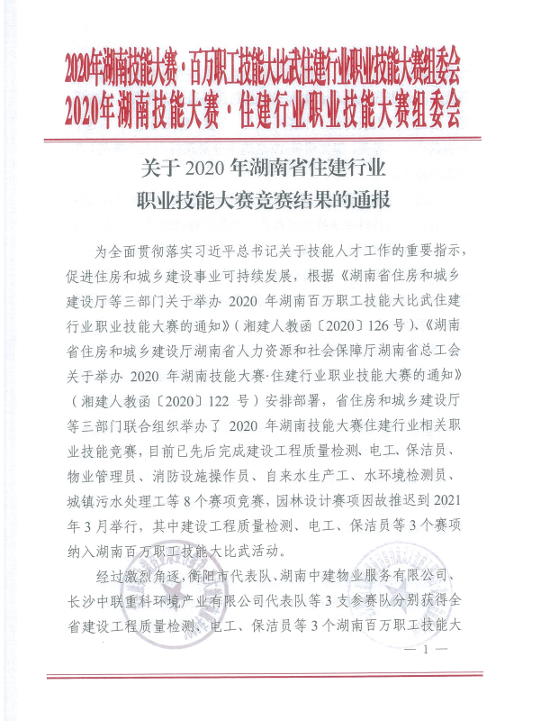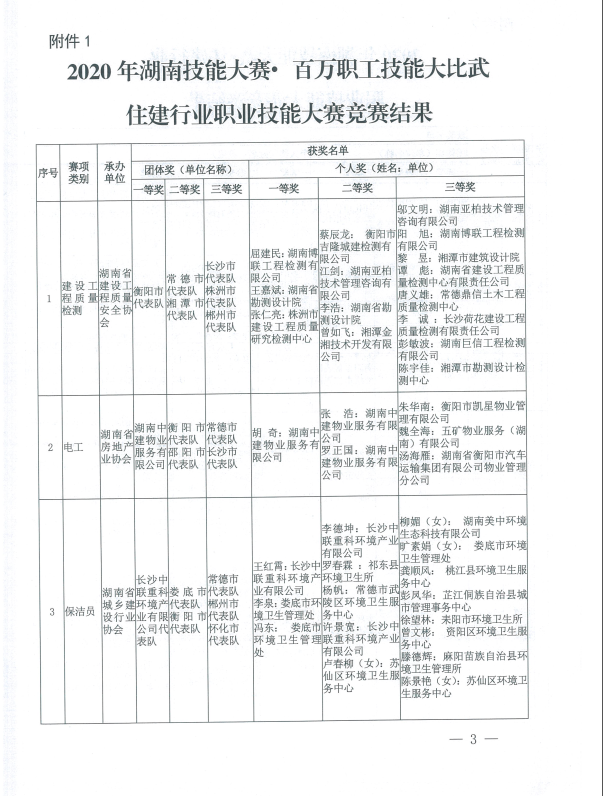 關于2020年湖南省住建行業職業技能大賽競賽結果的通報