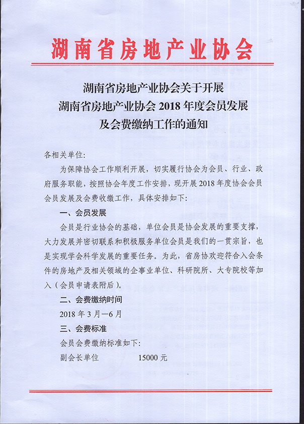 關(guān)于開展湖南省房地產(chǎn)業(yè)協(xié)會2018年度會員發(fā)展及會費繳納工作的通知