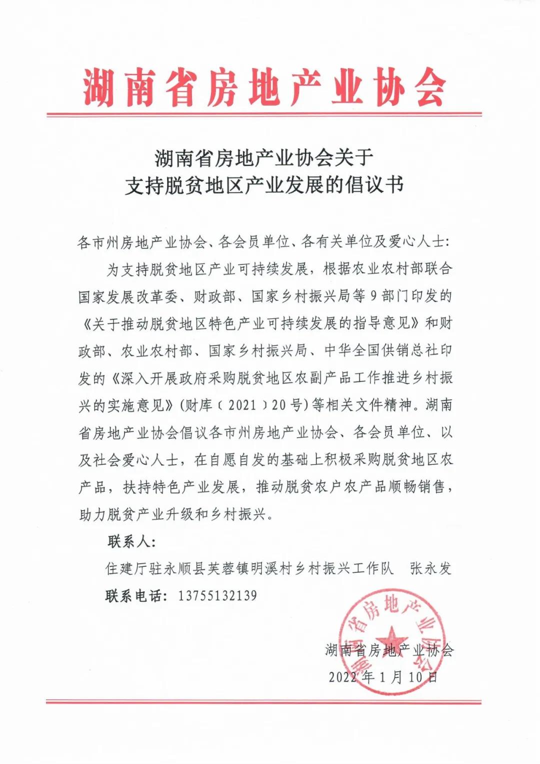 為支持脫貧地區產業可持續發展,根據農業農村部聯合國家發展改革委、財政部、國家鄉村振興局等9部門印發的《關于推動脫貧地區特色產業可持續發展的指導意見》和財政部、農業農村部、國家鄉村振興局、中華全國供銷總社印發的《深入開展政府采購脫貧地區農副產品工作推進鄉村振興的實施意見》(財庫﹝2021﹞20號)等相關文件精神。湖南省房地產業協會倡議各市州房地產業協會、各會員單位、以及社會愛心人士,在自愿自發的基礎上積極采購脫貧地區農產品,扶持特色產業發展,推動脫貧農戶農產品順暢銷售,助力脫貧產業升級和鄉村振興。