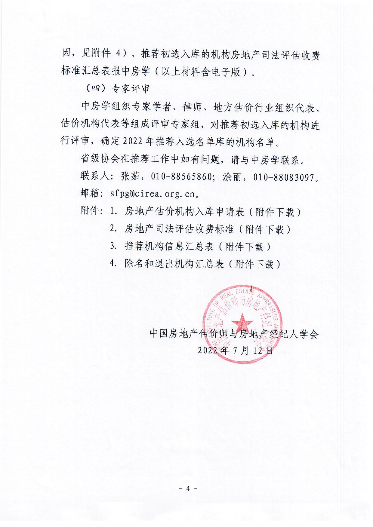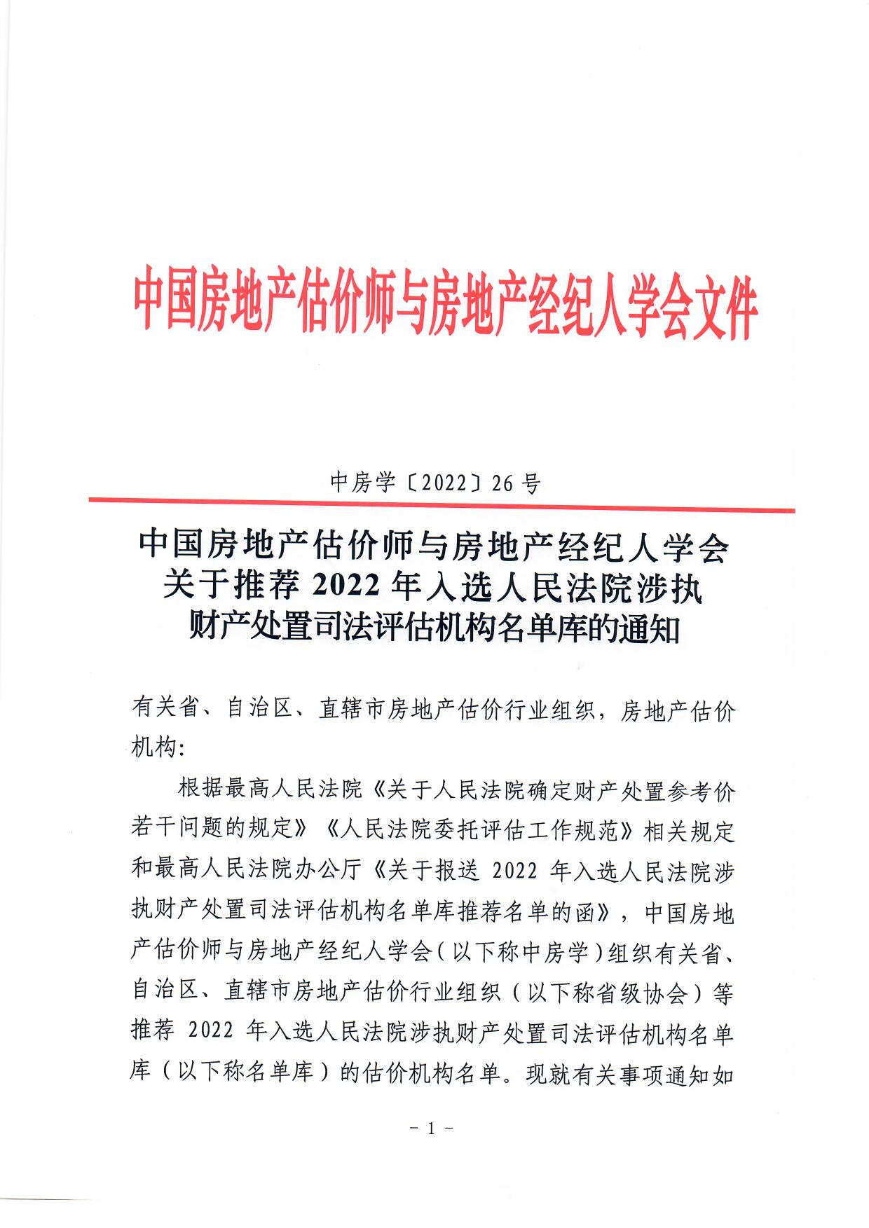 為配合中房學做好司法評估業務的房地產估價機構名單庫推選工作,現將中國房地產估價師與房地產經紀人學會《關于推薦2022年入選人民法院涉執財產處置司法評估機構名單庫的通知》(中房學〔2022〕26號),轉發給各有關單位并將有關事項補充如下: