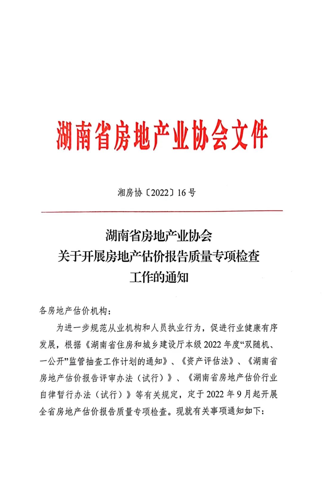 為進一步規范從業機構和人員執業行為,促進行業健康有序發展,根據《湖南省住房和城鄉建設廳本級2022年度“雙隨機、一公開”監管抽查工作計劃的通知》、《資產評估法》、《湖南省房地產估價報告評審辦法(試行)》、《湖南省房地產估價行業自律暫行辦法(試行)》等有關規定,定于2022年9月起開展全省房地產估價報告質量專項檢查。現就有關事項通知如下: