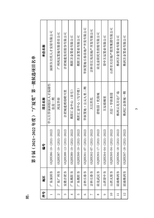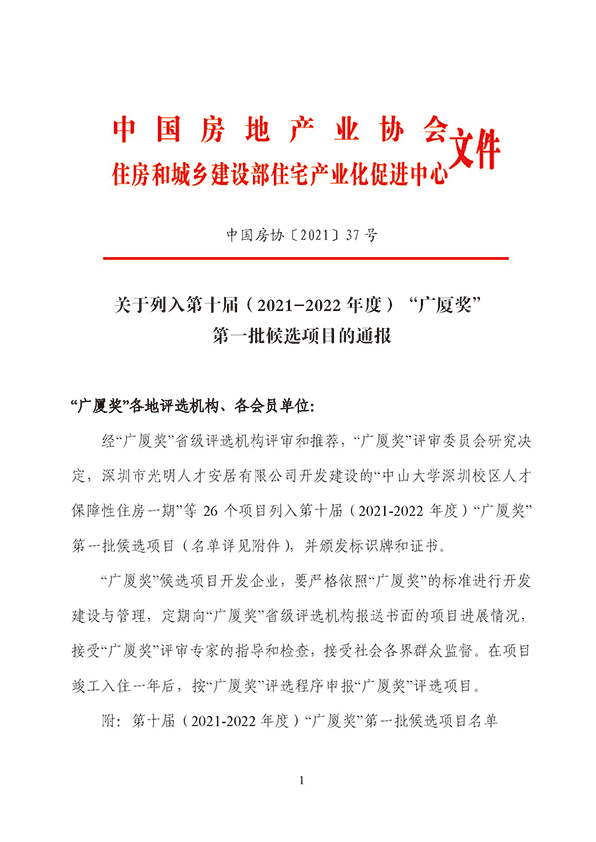 關于列入第十屆(2021-2022 年度)“廣廈獎”第一批候選項目的通報