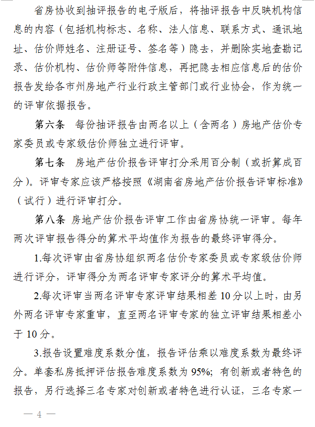 三、《辦法》第八條修改為:“房地產估價報告評審工作由省房協統一評審。每年兩次評審報告得分的算術平均值作為報告的最終評審得分。1.每次評審由省房協組織兩名估價專家委員或專家級估價師進行評分,評審得分為兩名評審專家評分的算術平均值。2.每次評審當兩名評審專家評審結果相差10分以上時,由另外兩名評審專家重審,直至兩名評審專家的獨立評審結果相差小于10分。3.報告設置難度系數分值,報告評估乘以難度系數為最終評分。單套私房抵押評估報告難度系數為95%;有創新或者特色的報告,另行選擇三名專家對創新或者特色進行認證,三名專家一致同意后確認難度系數,其難度系數分值區間為105%—110% ?!?/span>