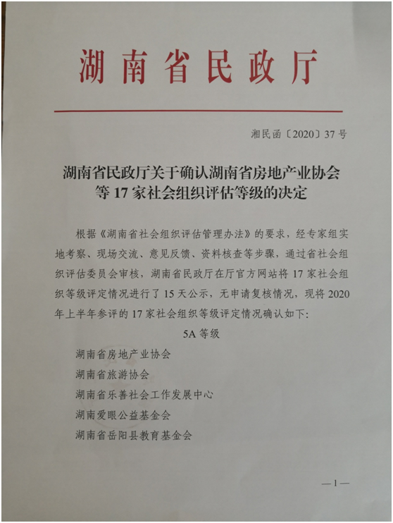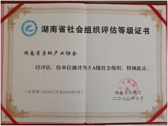 近日,湖南省民政廳發布《湖南省民政廳關于確認湖南省房地產業協會等17家社會組織評估等級的決定》(湘民函〔2020〕37號),我會被省民政廳評估為5A級社會組織!5A級社會組織稱號是民政廳對社會組織評估等級的最高等級,也是對行業組織綜合水平權威、全面的肯定。