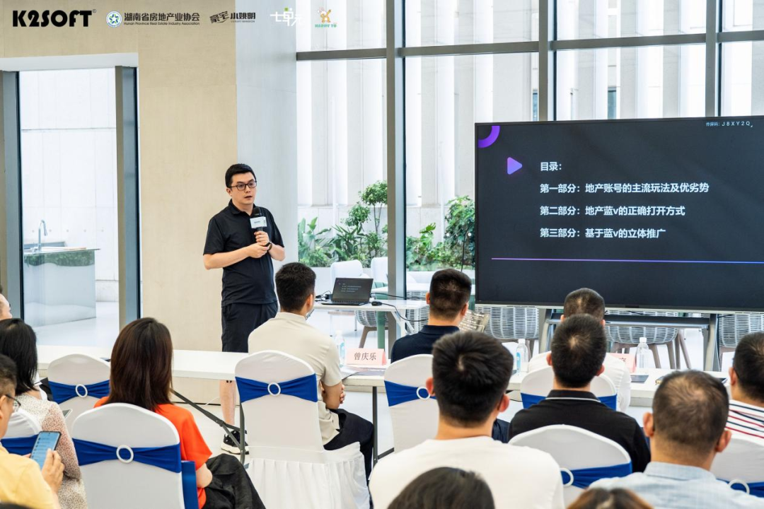 長沙七單元網絡科技有限公司總經理雷影率先做了《藍V號“超跑”:如何一騎絕塵,領跑市場?》的主題分享,作為操盤過潤和濱江灣、旭輝鉑悅湘江、印湘江NEW288、招商臻境、IFS 國金公寓、嘉臣道等項目新媒體營銷的實踐者,在會上著重分享了如何在內容為王的基礎上通過短視頻與直播精心打造企業藍V號實現線上營銷。