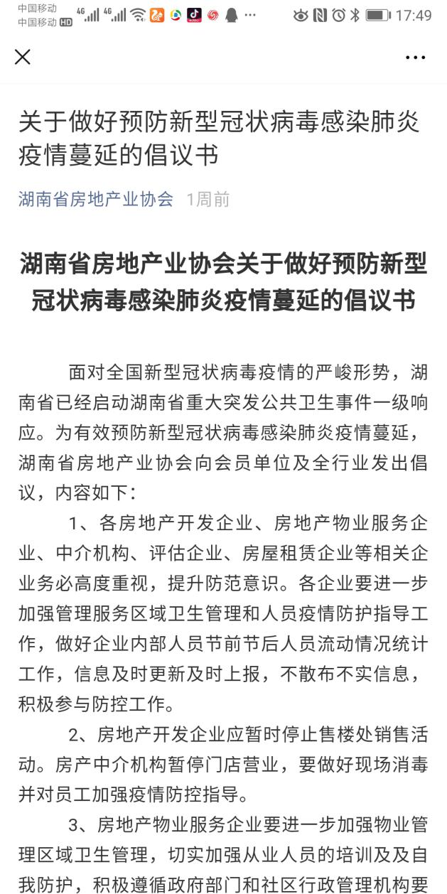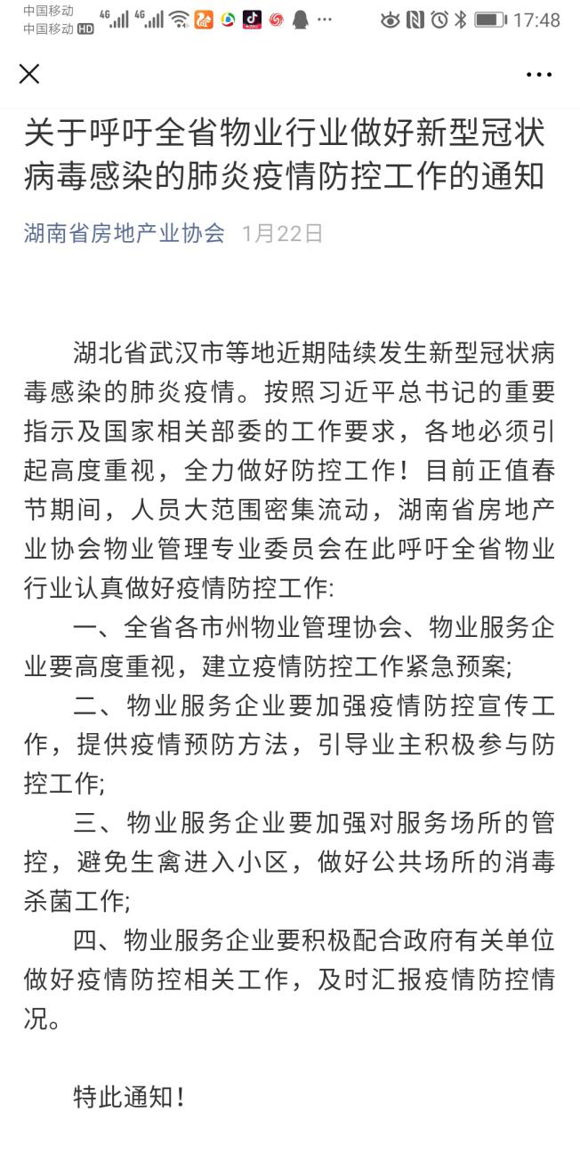 疫情就是命令,防控就是責任。肺炎疫情出現后,在國外與家人休年假的宋書記得知消息后第一時間通過網絡新聞了解了肺炎疫情概況,并迅速通過微信聯系了協會各部門負責人,針對疫情做出了應急工作安排,當天更是改簽了自己和家人回家的機票,提前取消了自己和家人的假期。1月26日,協會向全行業發布關于預防新型冠狀病毒感染肺炎疫情蔓延的倡議書,號召全行業和企業積極應對,高度重視科學理性做好防范措施,同心協力打贏疫情防控狙擊戰。前期重點對我省物業行業發出了呼吁,要求做好新型冠狀病毒感染的肺炎疫情防控工作,要求建立疫情防控工作緊急預案,加強疫情防控宣傳,引導業主積極參與防控工作,同時加強服務場所的管控,做好公共場所的消毒殺菌工作,并要積極配合政府有關單位做好疫情防控工作,及時匯報疫情情況。隨著疫情的迅速爆發,防疫形勢愈加嚴峻,為認真貫徹落實和加強行業疫情防控工作,回國后宋書記更是召集黨支部各支委和各部門負責人召開疫情防控緊急專項會議,結合協會工作職能和疫情形勢又對全省房地產業疫情防控工作進行了具體安排和部署。