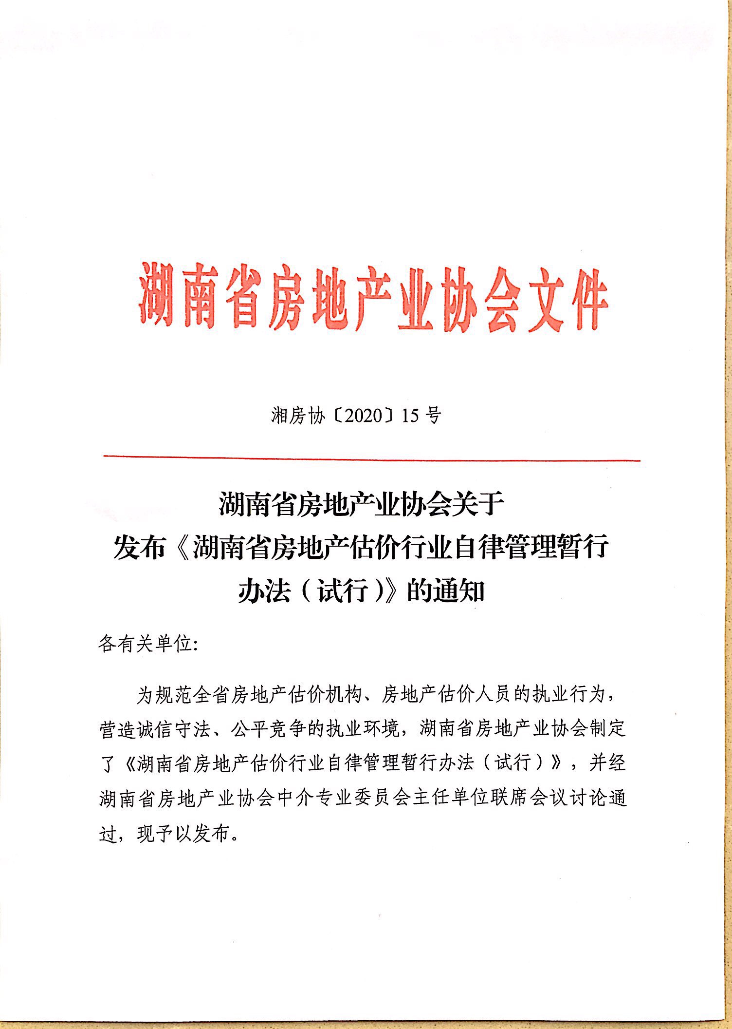 湖南省房地產(chǎn)業(yè)協(xié)會(huì)關(guān)于發(fā)布《湖南省房地產(chǎn)估價(jià)行業(yè)自律管理暫行辦法(試行)》的通知